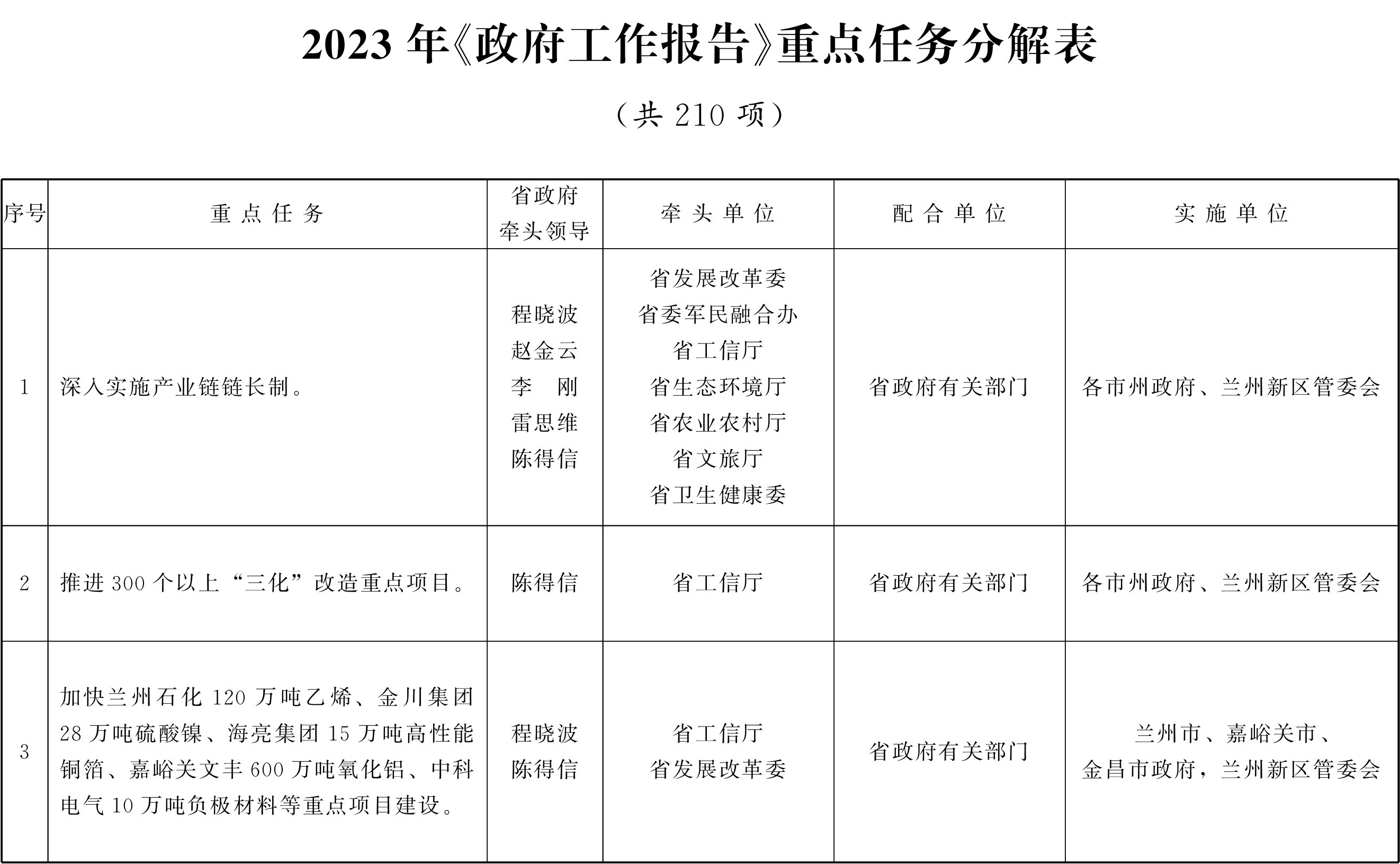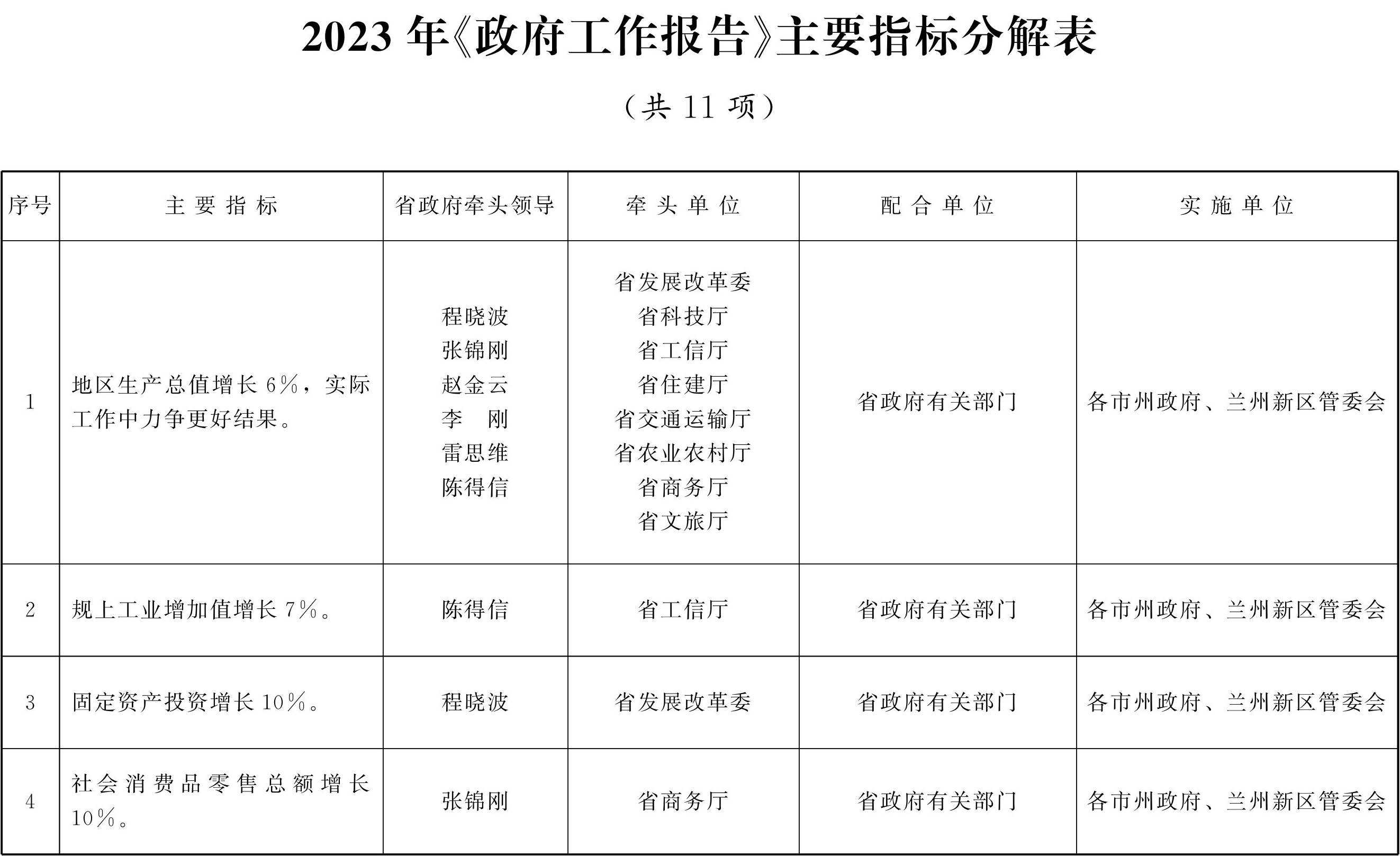 二、压实工作责任。各地各部门要根据《2023年〈政府工作报告〉主要指标分解表》(附件1)和《2023年〈政府工作报告〉重点任务分解表》(附件2)任务分工,进一步建立健全主要领导亲自抓、分管领导直接抓、业务部门全力落实的工作机制,明确时间表、任务书、路线图,实行清单式管理、项目化推进,做到工作目标明确、具体措施明确、责任领导明确、实施机构明确、具体责任人明确、完成时限明确。各牵头单位要于1月底前完成各项目标任务的细化分解,2月底前逐项制定具体工作措施,并报省政府备案。