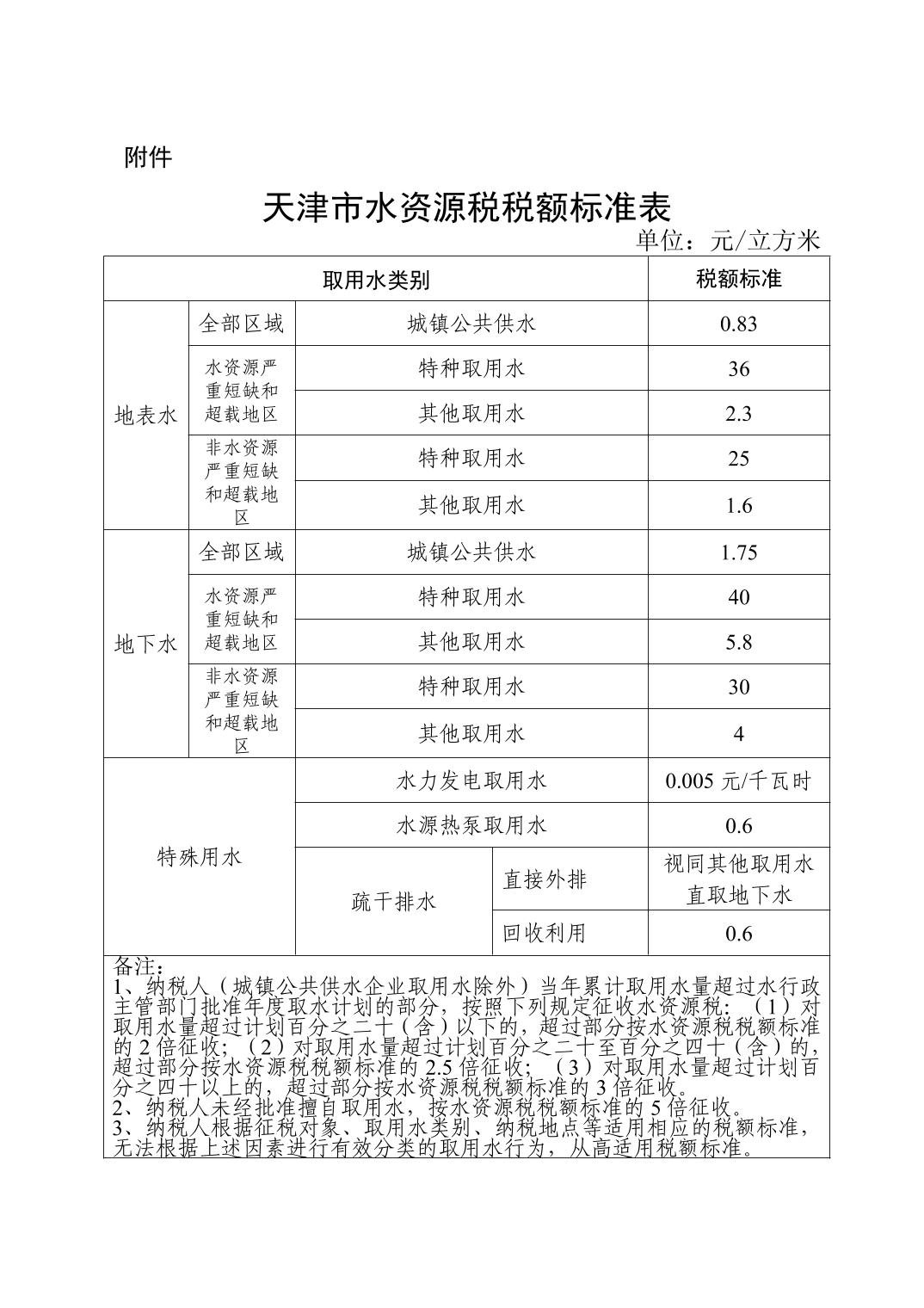 三、本市水资源税的适用税额依照本通知所附《天津市水资源税税额标准表》执行。